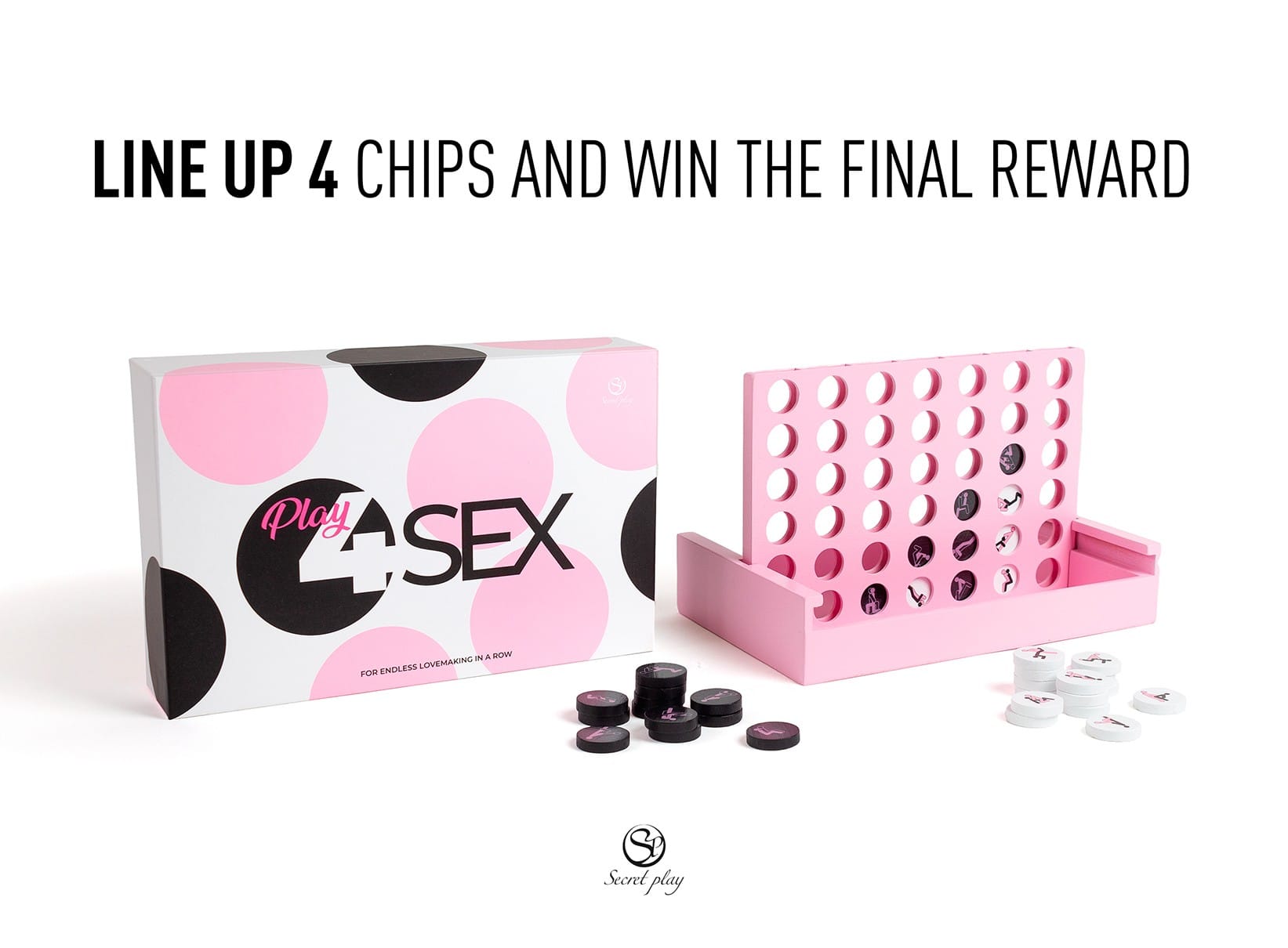 Alinhe 4 fichas da mesma cor numa fila antes do seu parceiro e ganhe a recompensa final.Vai querer jogar sem parar!CONTEÚDO:-42 fichas (21 cor-de-rosa + 21 pretas), cada uma com uma posição diferente do Kamasutra.-1 tabuleiro de jogo amovível.COMO JOGAR:Cada jogador escolhe uma cor para jogar.Atira uma moeda ao ar para determinar quem joga primeiro. Cada jogador coloca, à vez, uma ficha da cor que escolheu na grelha.O objetivo do jogo é fazer Play4Sex (alinhar 4 das suas fichas no tabuleiro na vertical, horizontal ou diagonal) e impedir o adversário de fazer o mesmo.O primeiro jogador a fazer Play4Sex em qualquer direção ganha a ronda, mas a melhor de 3 rondas ganha o jogo. O vencedor terá o direito de escolher uma posição do Kamasutra (das 4 opções que compõem a sua linha vencedora) para praticar com o seu parceiro no final do jogo.Se nenhum jogador conseguir obter 4 numa linha da mesma cor, há um empate e será jogada uma nova ronda para desempatar.Disponível em 8 línguas (espanhol, inglês, alemão, francês, holandês, português, italiano, polaco)
