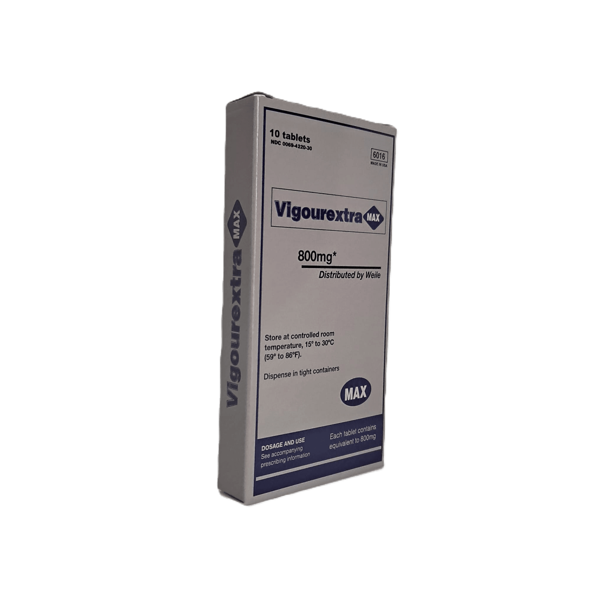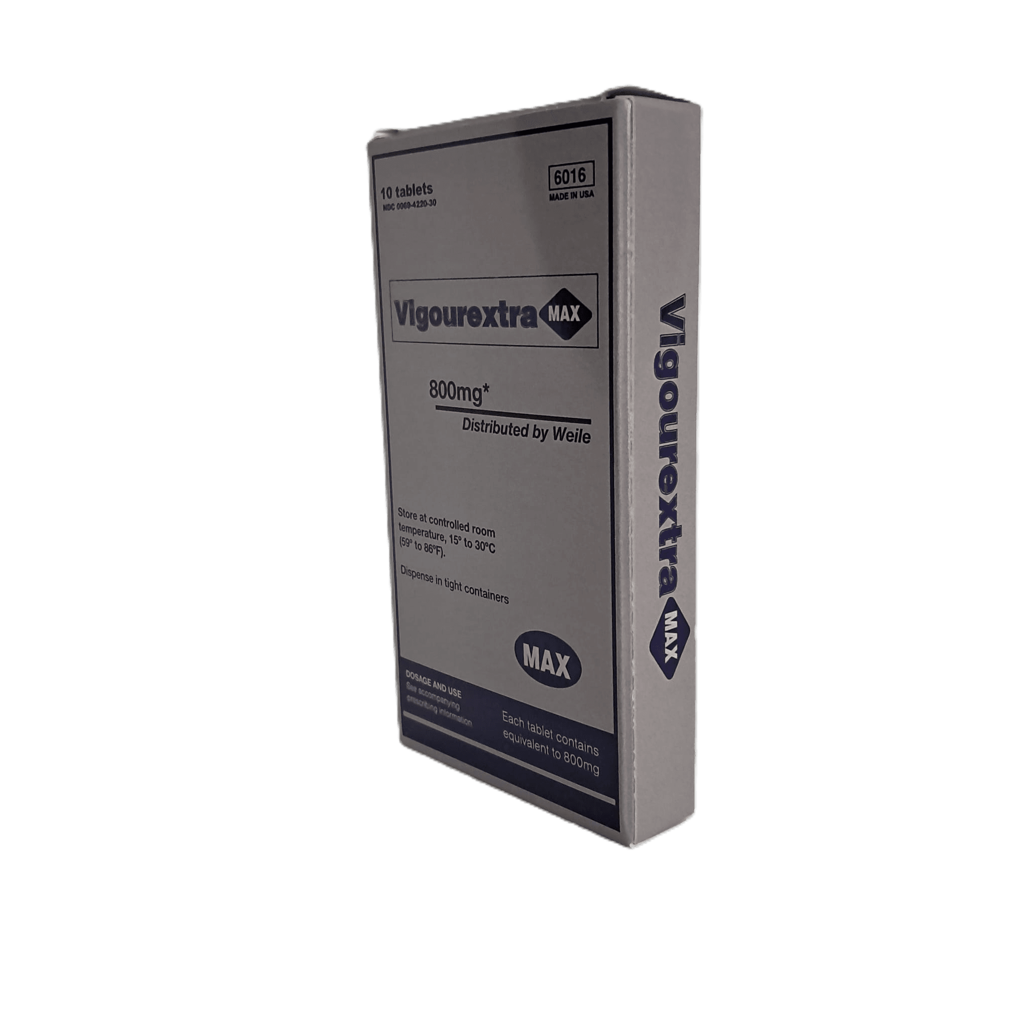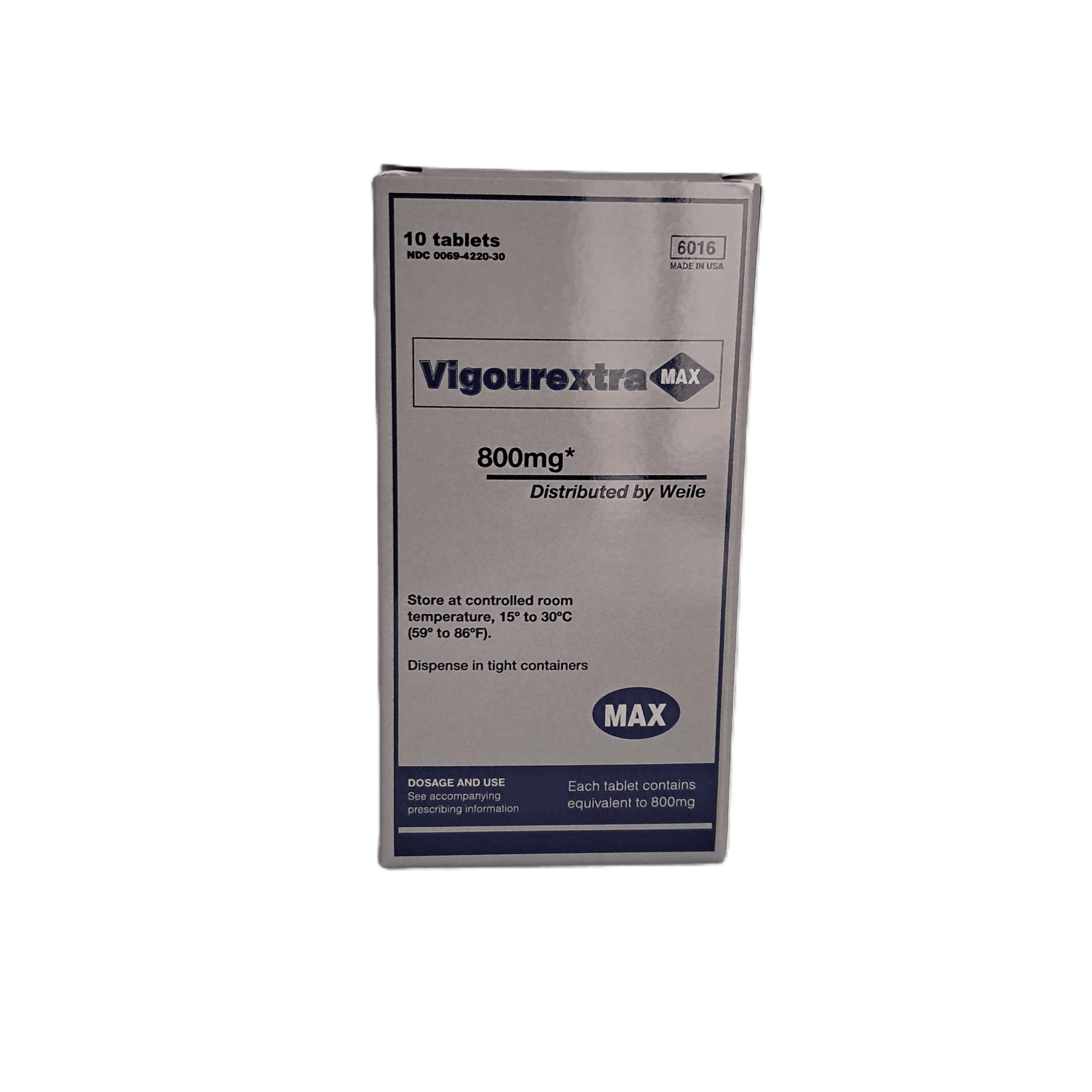 Uma Caixa de Vigourextra Max contém: 10 comprimidos, em doses de 800mg, cor azul.